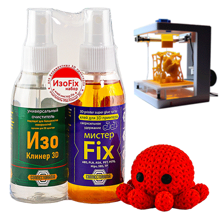 Клей высокой адгезии для 3D принтера «мистер Fix» надёжно удерживает деталь во время FDM печати. Перед обновлением истощившегося слоя, отработанное клеевое покрытие удаляется средством «Изо клинер 3D». Профессиональный комплект ИзоFix – это необходимый и самодостаточный комплект, который поднимет ваши печатные проекты на новый уровень!